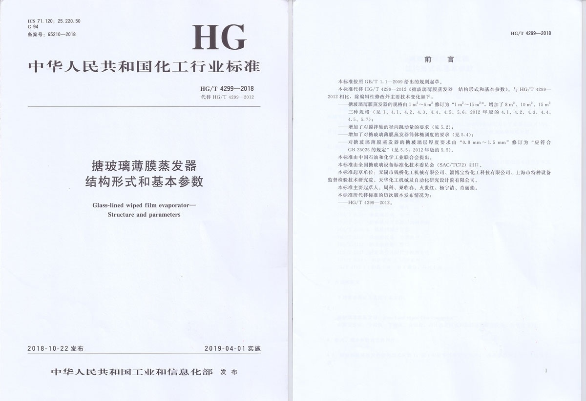 Wuxi Qianqiao Chemical Machinery Co., Ltd. participated in the drafting of the people's Republic of China chemical industry standard Hg / T 4299-2018 glass-lined wiped film evaporator structure and parameters.