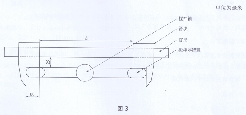 將待測攪拌器放平,如圖3所示,將直尺的兩個滑塊卡在攪拌器的兩個錨翼上,在直尺上讀出滑塊兩端的長度L,則攪拌器錨翼寬度值為L+120 mm,取3次測量的平均值與攪拌器標(biāo)準寬度之差的絕對值作為攪拌器錨翼寬度與標(biāo)準寬度的偏差。