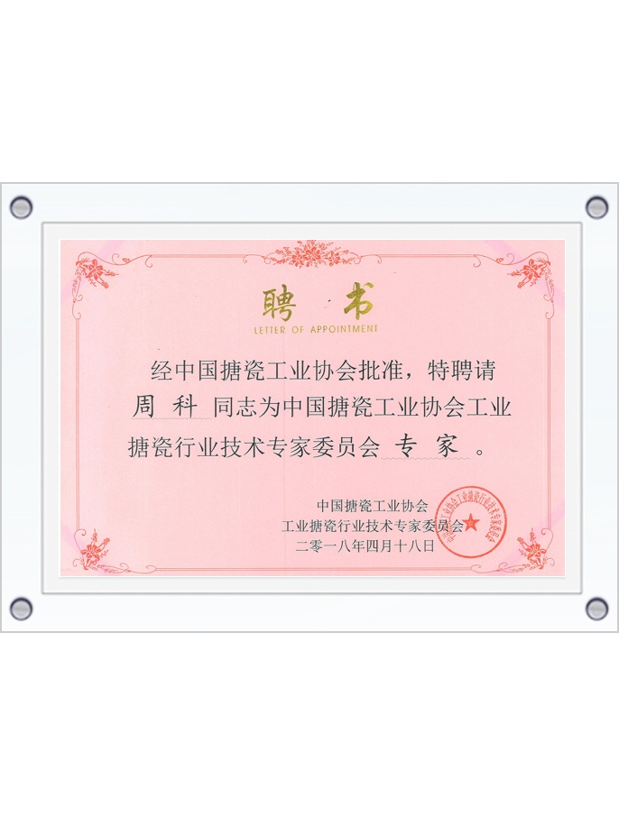 中國(guó)搪瓷工業(yè)協(xié)會(huì)專家聘書