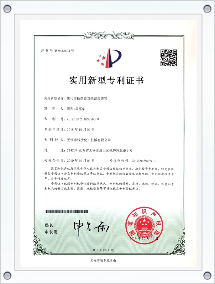 碳化硅換熱器雙側(cè)密封裝置專利證書